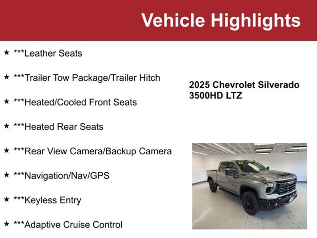 ***Leather Seats, ***Trailer Tow Package/Trailer Hitch, ***Heated/Cooled Front Seats, ***Heated Rear Seats, ***Rear View Camera/Backup Camera, ***Navigation/Nav/GPS, ***Keyless Entry, ***Adaptive Cruise Control, ***Remote Start, ***Bluetooth/Hands-Free Phone and Audio, ***Blind Spot Alert, ***Keyless Start, ***Premium Wheels, ***Bose Premium Audio, ***360 Camera, ***Power Liftgate, ***Reverse Sensing System, ***Park Assist, ***Lane Departure Warning, ***Satellite Radio, ***Heated Steering Wheel, ***Accident-Free Autocheck, ***1-Owner, ***Local Trade-In, 10-Speed Automatic, 4WD, Jet Black w/Perforated Leather Seating Surfaces, 120-Volt Bed Mounted Power Outlet, 120-Volt Interior Power Outlet, 170 Amp Alternator, 2 Charge/Data USB Ports Inside Center Console, 220 Amp Alternator, 6-Speaker Audio System Feature, Adaptive Cruise Control, Auto-Dimming Inside Rear-View Mirror, Auto-Dimming Inside Rearview Mirror w/Camera, Bed View Camera w/2 Trailer Camera Provisions, Black Beltline Moldings, Black Grille Bar w/Chevy Black Bow Tie, Bluetooth® For Phone, Body-Color Door Handles, Bose Premium 7-Speaker Sound System, Chevrolet Connected Access Capable, Chevytec Spray-On Black Bedliner, Chrome Door Handles, Chrome Mirror Caps, Color-Keyed Carpeting Floor Covering, Compass Located In Instrument Cluster, Deep-Tinted Glass, Electric Rear-Window Defogger, EZ Lift Power Lock & Release Tailgate, Floor-Mounted Center Console, Front Bucket Seats, Front Frame-Mounted Red Recovery Hooks, Front LED Fog Lamps, Front Rain-Sensing Wipers, Front Rubberized Vinyl Floor Mats, Gooseneck/5th Wheel Prep Package, HD Rear Vision Camera, HD Surround Vision, Heated 2nd Row Outboard Seats, Heated Steering Wheel, High Gloss Black Front Bumper, High Gloss Black Mirror Caps, High Gloss Black Rear Bumper, Hill Descent Control, Hitch Guidance w/Hitch View, In-Vehicle Trailering App System, Keyless Open & Start, LED Cargo Area Lighting, LTZ Convenience Package, LTZ Convenience Package II, LTZ Plus Package, Manual Tilt-Wheel/Telescoping Steering Column, Multicolor 15" Diagonal Head-Up Display, OnStar Services Capable, Power Door Locks, Power Front Windows w/Driver Express Up/Down, Power Front Windows w/Passenger Express Up/Down, Power Rear Windows w/Express Down, Power Sliding Rear Window w/Defogger, Preferred Equipment Group 1LZ, Push Button Start, Rear Cross Traffic Alert, Rear Rubberized-Vinyl Floor Mats, Rear Wheelhouse Liners, Remote Vehicle Starter System, Safety Alert Seat, Safety Package, SiriusXM w/360L Trial Subscription, Snow Plow Prep/Camper Package, Standard Tailgate, Steering Wheel Audio Controls, Steering Wheel Mounted Electronic Cruise Control, Suspension Package, Technology Package, Trail Boss Package, Trailer Camera Provisions, Trailer Side Blind Zone Alert, Ultrasonic Front & Rear Park Assist, Unauthorized Entry Theft-Deterrent System, Universal Home Remote, Up-Level Rear Seat w/Storage Package, Ventilated Driver & Front Passenger Seats, Wheels: 20" High-Gloss Black Painted, Wi-Fi Hotspot Capable, Wireless Charging, Wrapped Steering Wheel, Z71 Off-Road Package.