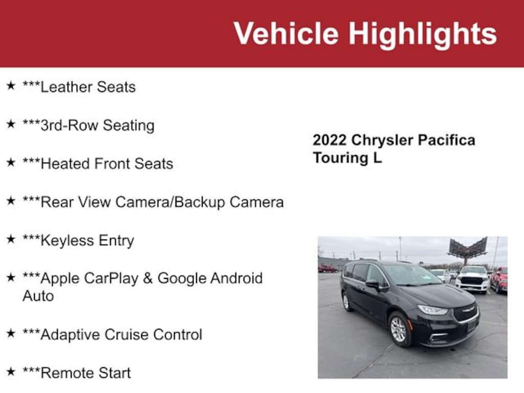 Boasting an array of premium features, this Pacifica Touring L is equipped to enhance your daily commute and family adventures. Enjoy the convenience of hands-free connectivity with Apple CarPlay and Android Auto, stay safe with advanced driver-assistance technologies like Blind Spot Alert and Lane Departure Warning, and indulge in the comfort of heated front seats and a heated steering wheel.