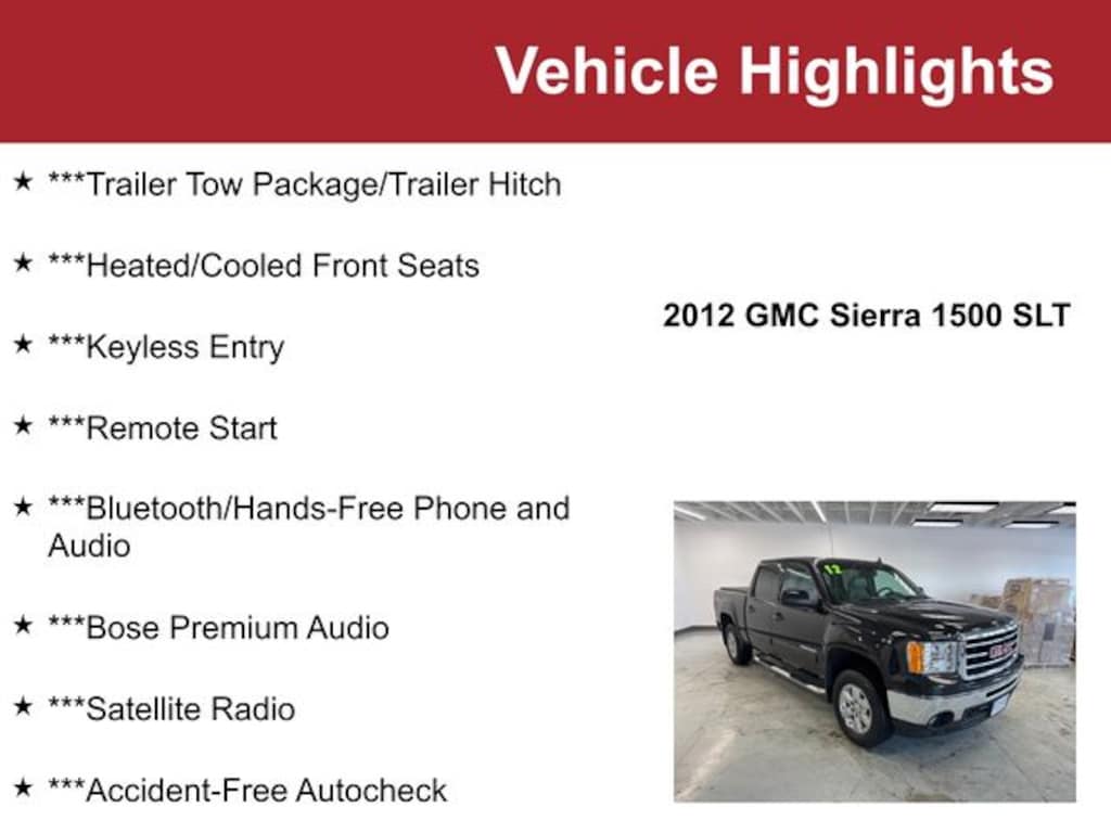 2012 GMC Sierra 1500 4D Crew Cab SLT Vortec 5.3L V8 SFI VVT Flex Fuel 4WD Carbon Black Metallic, Light Titanium/Dark Titanium Accents w/Leather-Appointed Front Seat Trim or Leather-Appointed Front Seat Trim