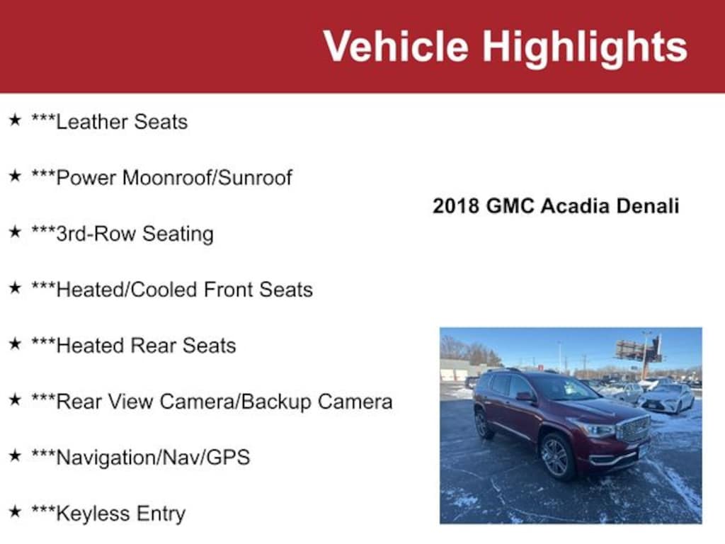 2018 GMC Acadia 4D Sport Utility Denali 3.6L V6 SIDI DOHC VVT AWD Crimson Red Tintcoat, Cocoa/Shale w/Perforated Leather-Appointed Seat Trim