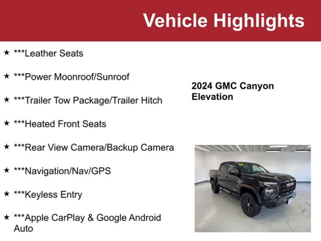 ***Leather Seats, ***Power Moonroof/Sunroof, ***Trailer Tow Package/Trailer Hitch, ***Heated Front Seats, ***Rear View Camera/Backup Camera, ***Navigation/Nav/GPS, ***Keyless Entry, ***Apple CarPlay & Google Android Auto, ***Adaptive Cruise Control, ***Remote Start, ***Bluetooth/Hands-Free Phone and Audio, ***Blind Spot Alert, ***Keyless Start, ***Reverse Sensing System, ***Lane Keep Assist, ***Lane Departure Warning, ***Satellite Radio, ***Accident-Free Autocheck, ***Trade-In, 4WD, 120-Volt Bed Mounted Power Outlet, 2 Rear USB Ports in Center Console (Charge-Only), 8-Way Power Driver Seat Adjuster, Adaptive Cruise Control, Automatic Emergency Braking, Canyon Pro Safety, Canyon Safety Plus Package, Convenience Package, CoreTec Seat Trim, Driver & Front Passenger Illuminated Visors, Driver Seatback Map Pocket, Dual-Zone Automatic Air Conditioning, Elevation Premium Package, EZ-Lift & Lower Tailgate, Following Distance Indicator, Forward Collision Alert, Front LED Fog Lamps, Front Pedestrian & Bicyclist Braking, HD Surround Vision, Heated Driver & Front Passenger Seats, Heated Power-Adjustable Outside Mirrors, Inside Rear-View Auto-Dimming Mirror, IntelliBeam Automatic High Beam On/Off, Interior Overhead Courtesy Light w/Dual Reading Lamp, Lane Keep Assist w/Lane Departure Warning, Manual Rear-Sliding Window, MultiStow Tailgate, Power Driver Lumbar Control Seat Adjuster, Preferred Equipment Group 4VL, Preferred Package, Rear Center Fold-Down Armrest w/2 Cupholders, Rear Cross Traffic Braking, Rear of Console 120-Volt Power Outlet, Rear Pedestrian Alert, Rear-Window Electric Defogger, Remote Vehicle Starter System, Tailgate Keyed Cylinder Lock, Technology Package, Tilt & Telescopic Manual Steering Column, Trailer Brake Controller, Trailering Package, Ultrasonic Rear Park Assist.