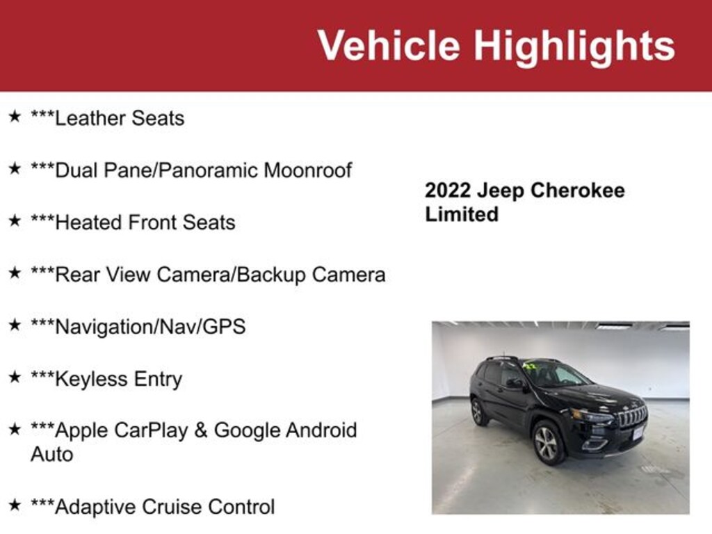 This 1-owner, accident-free 2022 Jeep Cherokee Limited is a true gem, offering an unparalleled blend of capability, comfort, and technology. Experience the ultimate in SUV refinement and versatility â" visit our showroom today and discover the difference for yourself.