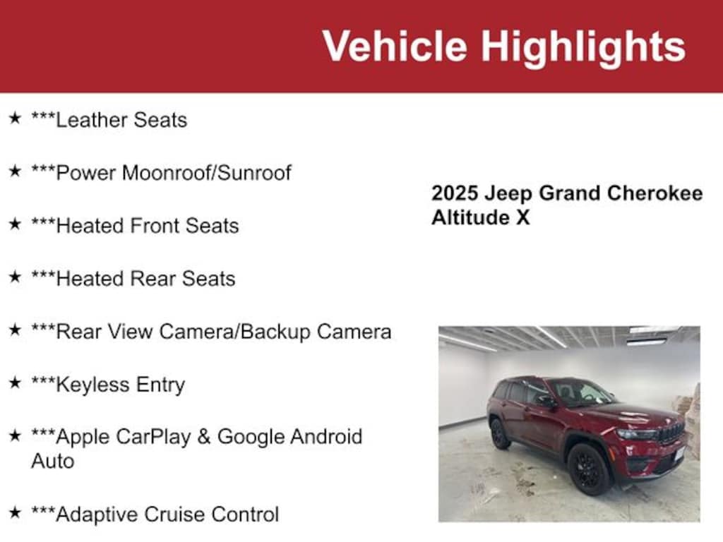 2025 Jeep Grand Cherokee 4D Sport Utility Altitude X 3.6L V6 24V VVT 4WD Velvet Red Pearlcoat, Global Black w/Capri Leather/Suede Seats