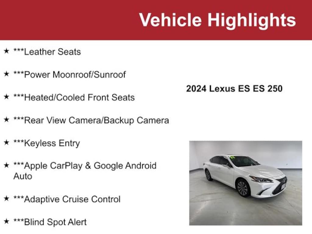 With a meticulously maintained Accident-Free Autocheck and a single previous owner, this 2024 Lexus ES 250 is a true gem. Discover the exceptional craftsmanship, advanced technology, and uncompromising comfort that make this luxury sedan a standout choice.