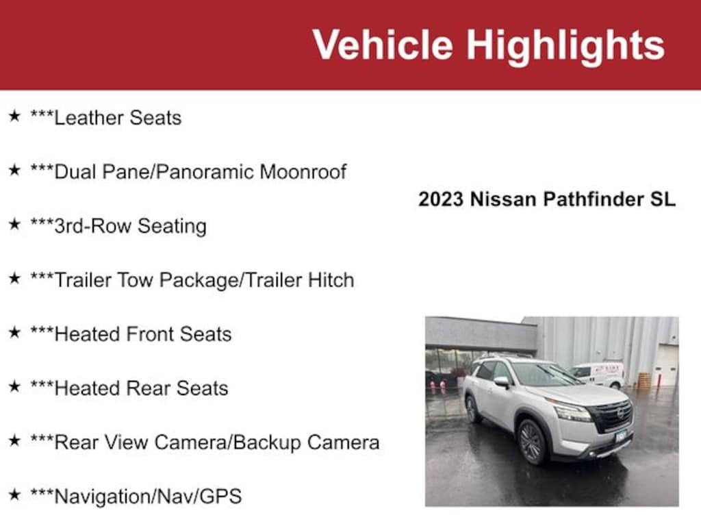 ***Leather Seats, ***Dual Pane/Panoramic Moonroof, ***3rd-Row Seating, ***Trailer Tow Package/Trailer Hitch, ***Heated Front Seats, ***Heated Rear Seats, ***Rear View Camera/Backup Camera, ***Navigation/Nav/GPS, ***Keyless Entry, ***Apple CarPlay & Google Android Auto, ***Adaptive Cruise Control, ***Remote Start, ***Bluetooth/Hands-Free Phone and Audio, ***Blind Spot Alert, ***Keyless Start, ***Premium Wheels, ***Bose Premium Audio, ***Middle Row Buckets, ***360 Camera, ***Power Liftgate, ***Reverse Sensing System, ***Park Assist, ***Lane Keep Assist, ***Lane Departure Warning, ***Satellite Radio, ***Roof Rack, ***Heated Steering Wheel, ***Accident-Free Autocheck, ***1-Owner, ***Local Trade-In, 4WD, 20" Painted Alloy Wheels, 2nd-Row Captain Chairs, 2nd-Row Removable Center Console, Black Appearance Package, Black Grille (K10), Black Liftgate Emblems, Bose Premium Audio System, Heated Rear Seats, Panoramic Moonroof, Pathfinder Wordmark, SL Premium Package, Tow Hitch Receiver & Harness.