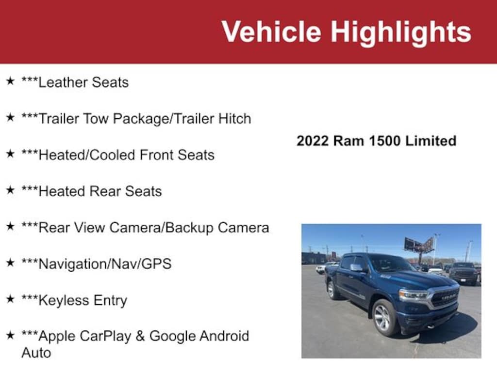 2022 Ram 1500 4D Crew Cab Limited HEMI 5.7L V8 Multi Displacement VVT 4WD Patriot Blue Pearlcoat, Indigo/Sea Salt w/Premium Leather Bucket Seats