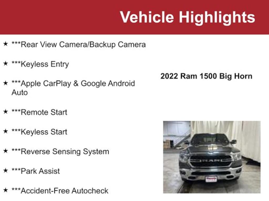 ***Rear View Camera/Backup Camera***Keyless Entry***Apple CarPlay & Google Android Auto***Remote Start***Keyless Start***Reverse Sensing System***Park Assist***Accident-Free Autocheck***1-Owner, ***Local Trade-In, 2nd Row In Floor Storage Bins, 4G LTE Wi-Fi Hot Spot, 8.4" Touchscreen Display, Apple CarPlay/Android Auto, Auto-Dimming Exterior Driver Mirror, Auto-Dimming Rear-View Mirror, Big Horn Badge, Big Horn Level A Equipment Group (DISC), Black Premium Power Mirrors (GUL), Bluetooth Handsfree Phone & Audio, Class IV Receiver Hitch, Cluster 3.5" TFT Color Display, Connectivity - US/Canada, Exterior Mirrors Courtesy Lamps, Exterior Mirrors w/Supplemental Signals, Foam Bottle Insert (Door Trim Panel), For More Info, Call 800-643-2112, Glove Box Lamp, Google Android Auto, Integrated Center Stack Radio, Power 2-Way Driver Lumbar Adjust, Power 8-Way Driver Seat, Power Adjustable Pedals, Quick Order Package 23Z Big Horn, Rear Dome w/On/Off Switch Lamp, Rear Power Sliding Window, Rear Underseat Compartment Storage, Rear Window Defroster, SiriusXM Radio Service, SiriusXM Satellite Radio, Sun Visors w/Illuminated Vanity Mirrors, Uconnect 5 W w/8.4" Display, Universal Garage Door Opener, USB Host Flip.