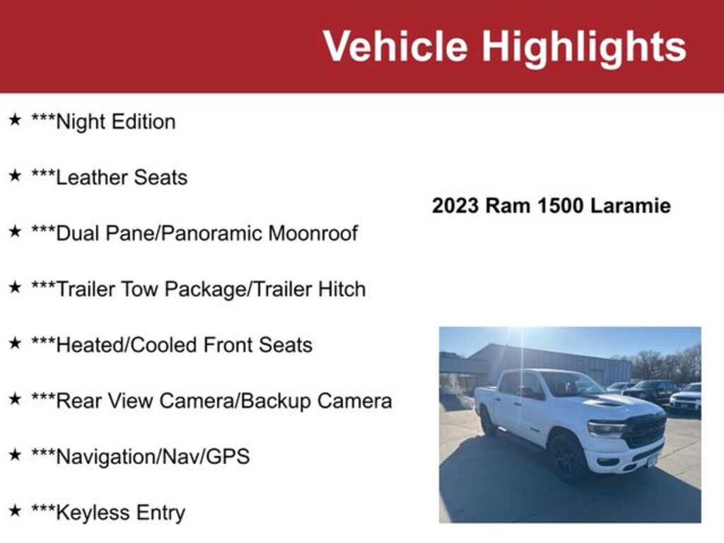 ***Night Edition, ***Leather Seats, ***Dual Pane/Panoramic Moonroof, ***Trailer Tow Package/Trailer Hitch, ***Heated/Cooled Front Seats, ***Rear View Camera/Backup Camera, ***Navigation/Nav/GPS, ***Keyless Entry, ***Apple CarPlay & Google Android Auto, ***Remote Start, ***Bluetooth/Hands-Free Phone and Audio, ***Blind Spot Alert, ***Keyless Start, ***Premium Wheels, ***Harmon Kardon Premium Audio, ***Power Liftgate, ***Reverse Sensing System, ***Park Assist, ***Satellite Radio, ***Heated Steering Wheel, ***Accident-Free Autocheck, ***1-Owner, ***Local Trade-In, #1 Seat Foam Cushion, 12" Touchscreen Display, 2nd Row In Floor Storage Bins, 3 Rear Seat Head Restraints, 4 Way Front Headrests, 4G LTE Wi-Fi Hot Spot, Accent Color Door Handles, Accent Color Premium Power Mirrors, Apple CarPlay/Android Auto, Auto High Beam Headlamp Control, Auto-Dimming Exterior Driver Mirror, Black Exterior Truck Badging, Black Headlamp Bezels, Black Interior Accents, Black Painted Exterior Mirrors Caps, Blind Spot & Cross Path Detection, Body Color Front Bumper, Body Color Rear Bumper w/Step Pads, Bucket Seats, Center Console Parts Module, Connected Travel & Traffic Services, Connectivity - US/Canada, Convex Wide-Angle Exterior Mirror Insert, Disassociated Touchscreen Display, Driver Seat Memory, Dual Exhaust w/Black Tips, Electric Shift-On-Demand Transfer Case, Exterior Mirrors Courtesy Lamps, Exterior Mirrors w/Heating Element, Exterior Mirrors w/Memory, Exterior Mirrors w/Supplemental Signals, Foam Bottle Insert (Door Trim Panel), For Details, Visit DriveUconnect.com, For More Info, Call 800-643-2112, Front Door Accent Lighting, Front LED Fog Lamps, Front Seat Back Map Pockets, Full Length Upgraded Floor Console, Global Telematics Box Module (TBM), Google Android Auto, GPS Antenna Input, GPS Navigation, Grille Surround 3 Black Texture 2 Black, Harman/Kardon 19 Speaker Premium Sound, HD Radio, Heated Front Seats, Heated Steering Wheel, Integrated Center Stack Radio, Integrated Voice Command w/Bluetooth, Laramie Level B Equipment Group, Leather Trimmed Bucket Seats, LED Reflector Headlamps, Night Edition, ParkSense Front/Rear Park Assist w/Stop, Power 2-Way Driver Lumbar Adjust, Power 2-Way Passenger Lumbar Adjust, Power 8-Way Driver & Passenger Seats, Power-Folding Mirrors, Quick Order Package 27H Laramie, Rain Sensitive Windshield Wipers, RAM Grille Badge - Black, Rear 60/40 Folding Seat, Rear Door Accent Lighting, Rear Power Sliding Window, Rear Underseat Compartment Storage, Rear Window Defroster, Remote Tailgate Release, SiriusXM Radio Service, SiriusXM w/360L, Sport Performance Hood, Uconnect 5 Nav w/12.0" Display, USB Host Flip, Ventilated Front Seats, Wheels: 22" x 9" Forged Aluminum.