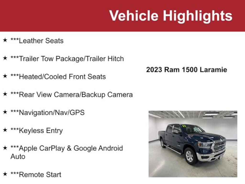 ***Leather Seats, ***Trailer Tow Package/Trailer Hitch, ***Heated/Cooled Front Seats, ***Rear View Camera/Backup Camera, ***Navigation/Nav/GPS, ***Keyless Entry, ***Apple CarPlay & Google Android Auto, ***Remote Start, ***Bluetooth/Hands-Free Phone and Audio, ***Blind Spot Alert, ***Keyless Start, ***Harmon Kardon Premium Audio, ***Power Liftgate, ***Reverse Sensing System, ***Park Assist, ***Satellite Radio, ***Heated Steering Wheel, ***Accident-Free Autocheck, ***1-Owner, 12" Touchscreen Display, 2nd Row In Floor Storage Bins, 4G LTE Wi-Fi Hot Spot, Apple CarPlay/Android Auto, Auto High Beam Headlamp Control, Blind Spot & Cross Path Detection, Connected Travel & Traffic Services, Connectivity - US/Canada, Disassociated Touchscreen Display, Electric Shift-On-Demand Transfer Case, Foam Bottle Insert (Door Trim Panel), For Details, Visit DriveUconnect.com, For More Info, Call 800-643-2112, Front Door Accent Lighting, Front LED Fog Lamps, Global Telematics Box Module (TBM), Google Android Auto, GPS Antenna Input, GPS Navigation, HD Radio, Integrated Center Stack Radio, Integrated Voice Command w/Bluetooth, Laramie Level 1 Equipment Group, LED Reflector Headlamps, ParkSense Front/Rear Park Assist w/Stop, Quick Order Package 28H Laramie, Rain Sensitive Windshield Wipers, Rear Door Accent Lighting, Rear Power Sliding Window, Rear Window Defroster, Remote Tailgate Release, SiriusXM Radio Service, SiriusXM w/360L, Uconnect 5 Nav w/12.0" Display, USB Host Flip.